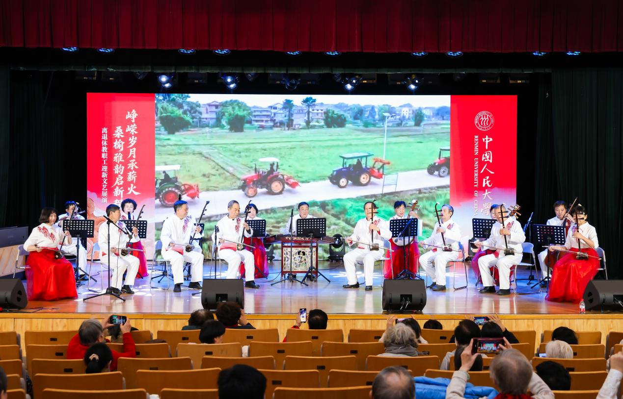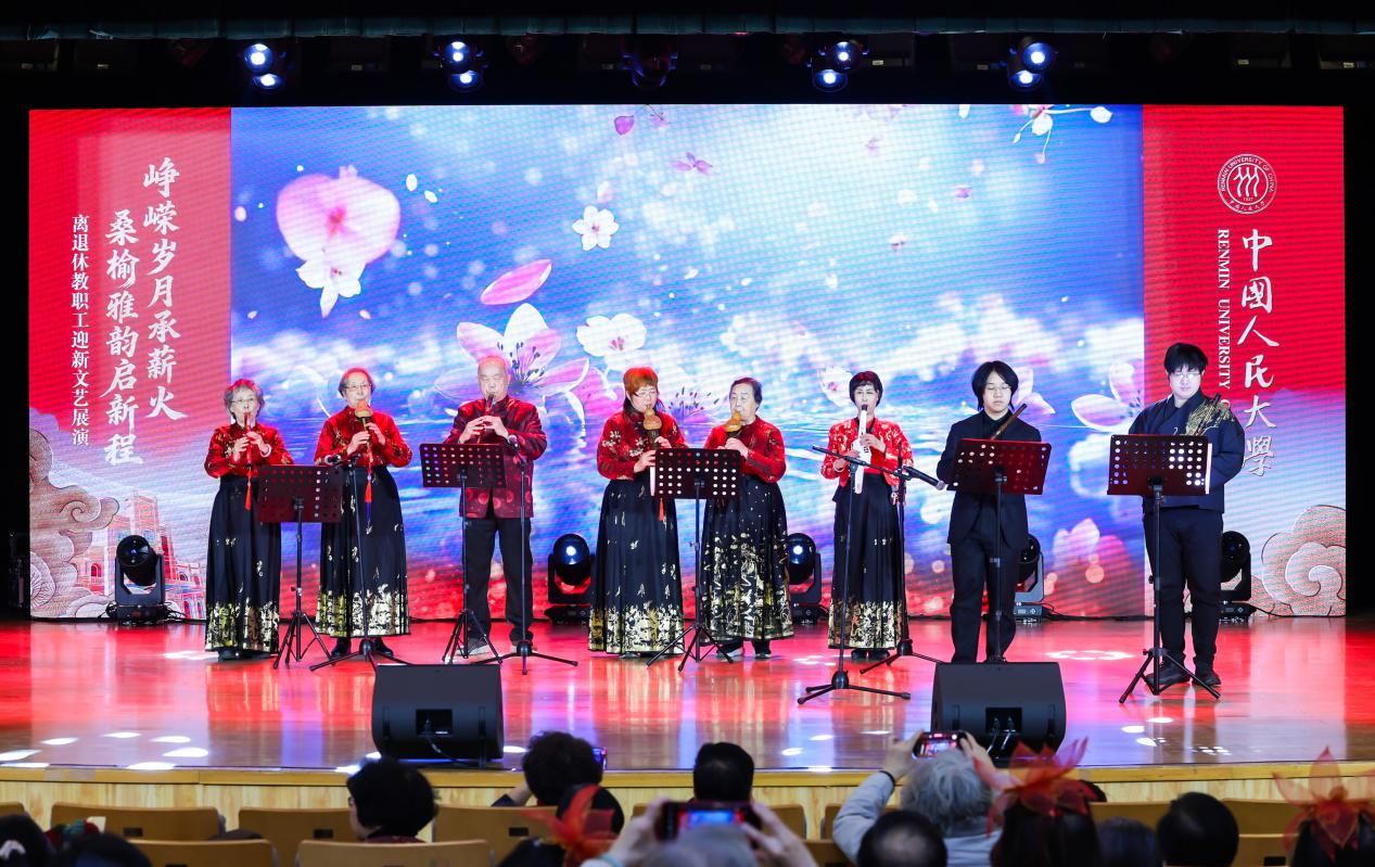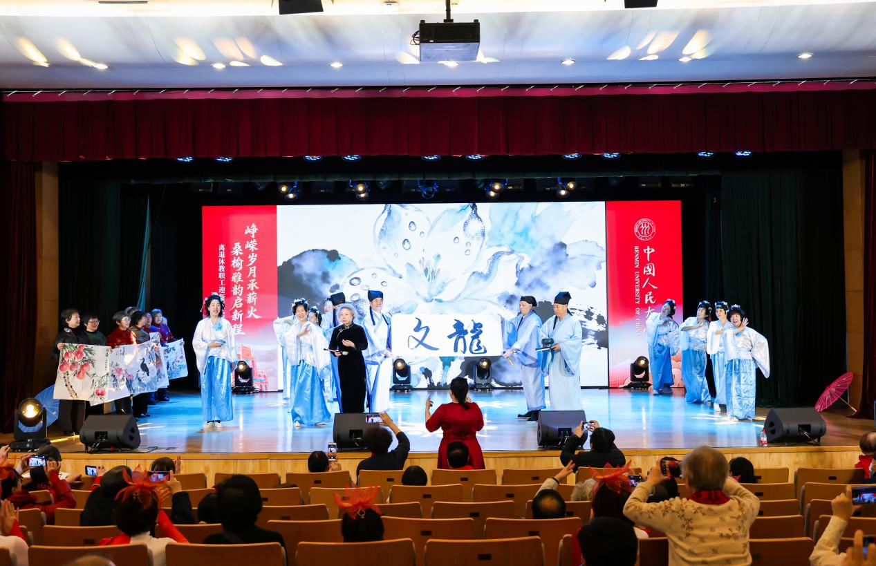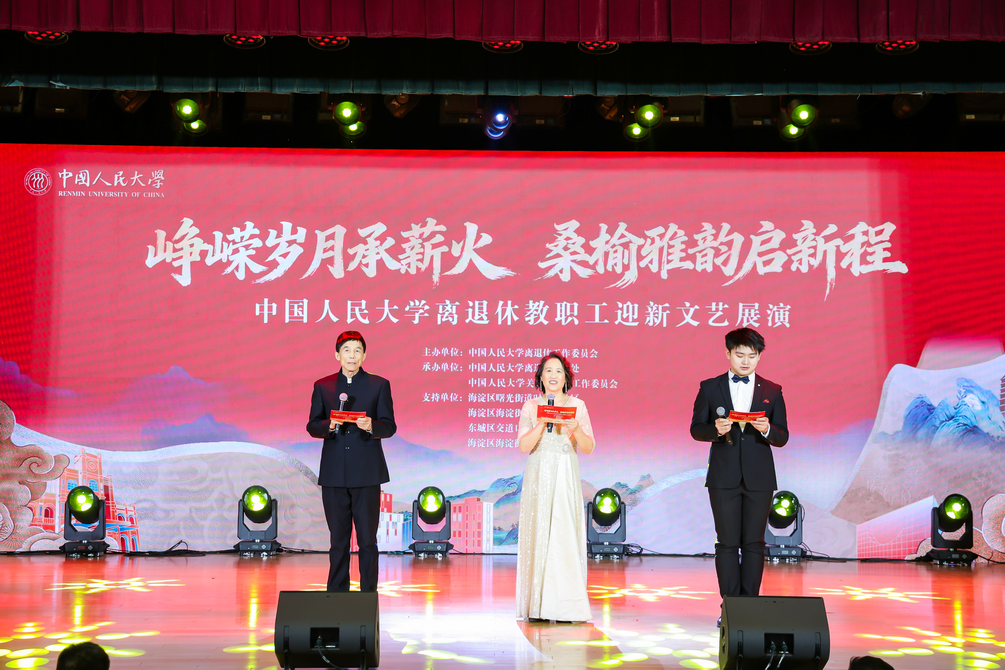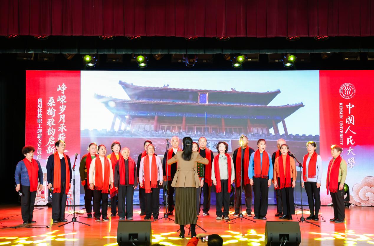 中国人民大学“峥嵘岁月承薪火,桑榆雅韵启新程”离退休教职工迎新文艺展演由中国人民大学离退休工作委员会主办,中国人民大学离退休工作处、中国人民大学关心下一代工作委员会协办,并得到海淀区曙光街道时雨园社区、海淀区海淀街道人民大学社区、东城区交道口街道府学社区、海淀区海淀街道人大附中社区的特别支持。全校离退休教职工欢聚一堂,以多元艺术形式忆峥嵘、享韶华、向新行,尽显银发风采与赤子初心。