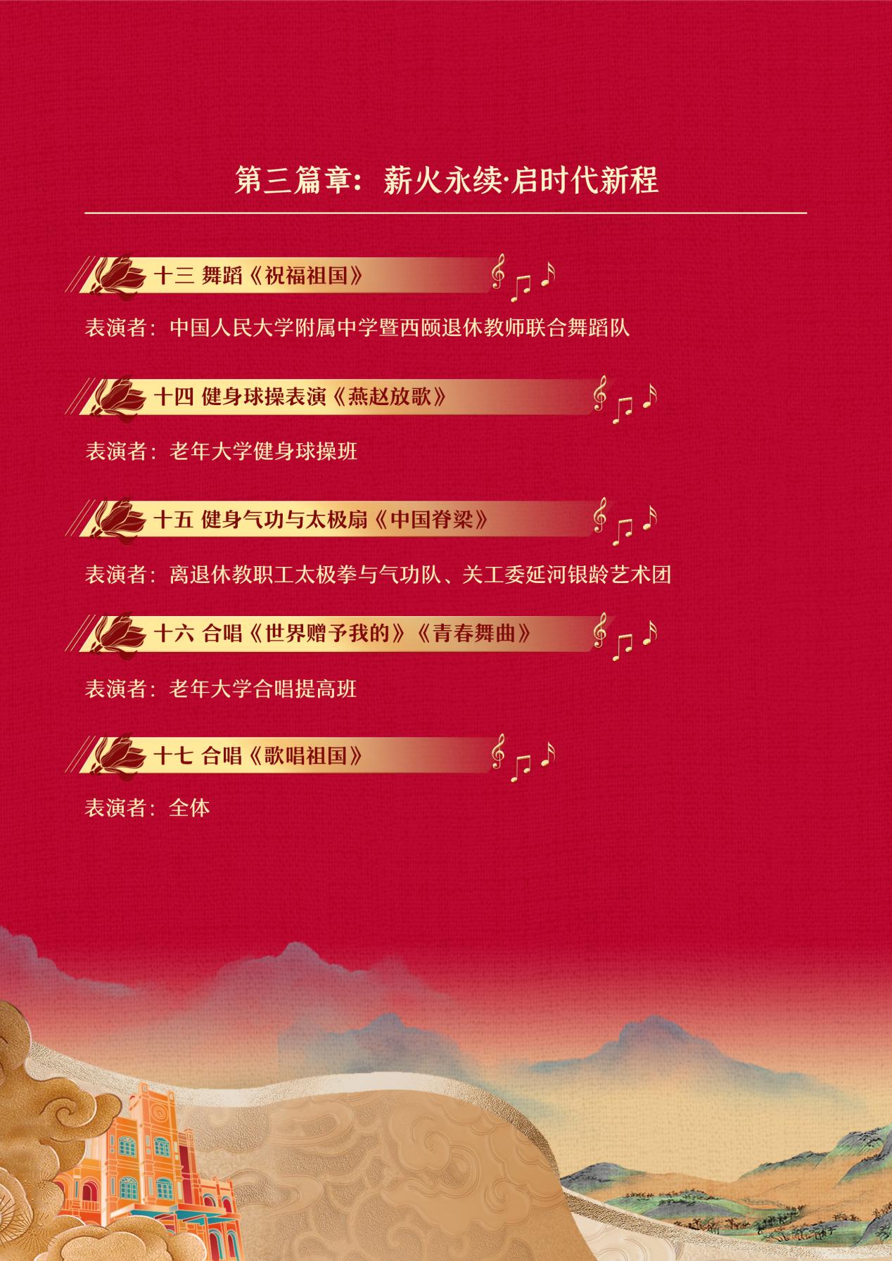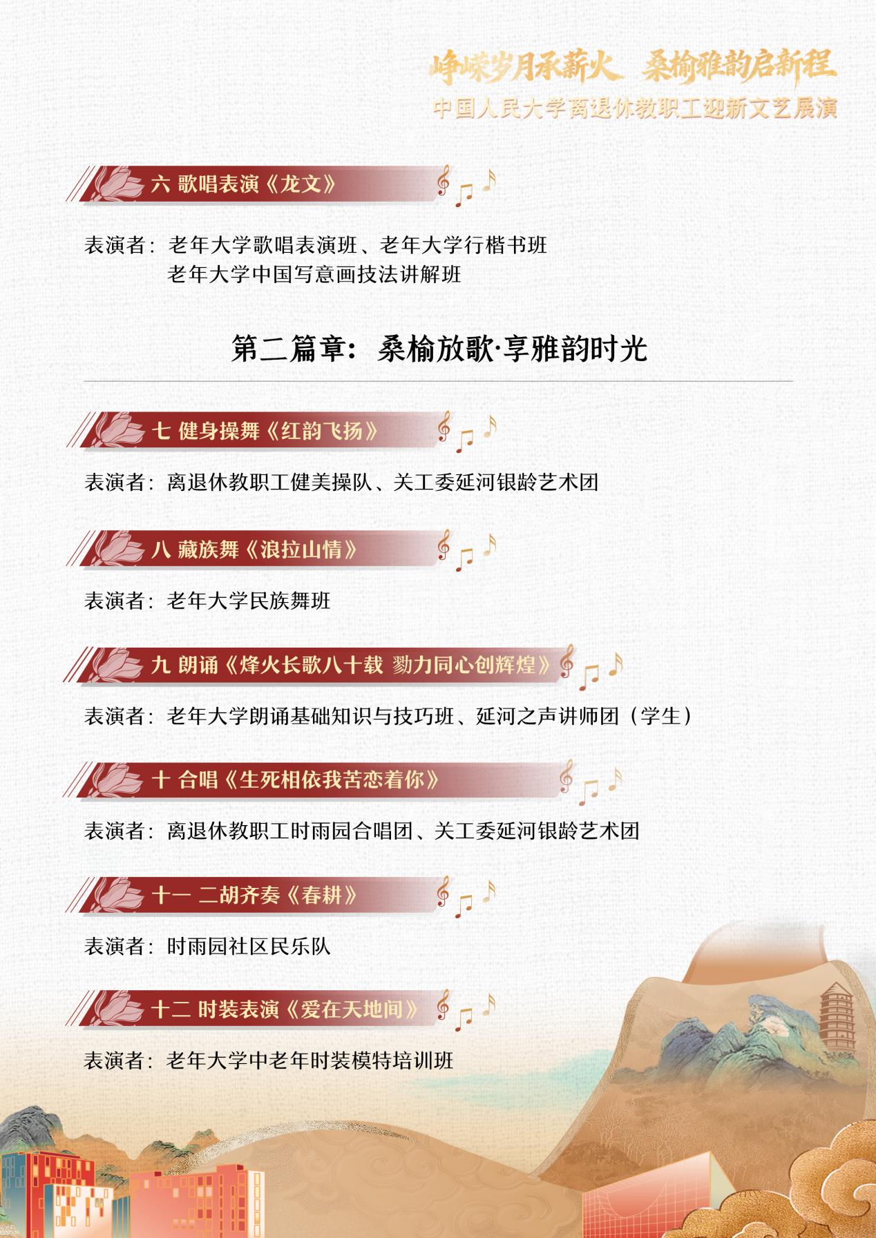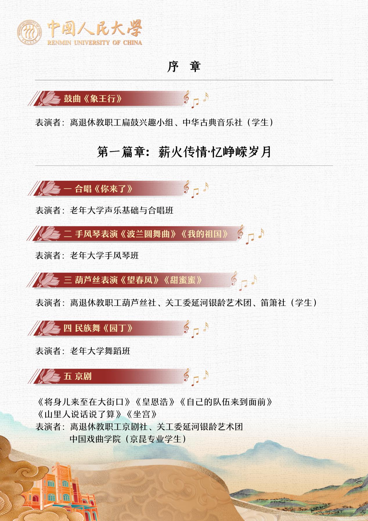 2025年度教职工荣休仪式暨荣誉一级教授授予仪式、离退休教职工迎新文艺展演即将启幕。“峥嵘岁月承薪火,桑榆雅韵启新程”中国人民大学离退休教职工迎新文艺展演活动由中国人民大学离退休工作委员会主办,中国人民大学离退休工作处、关心下一代工作委员会承办。本次活动汇聚老中青少几代人同台献艺,特邀中国人民大学附属中学、曙光街道时雨园社区党委、中国戏曲学院等单位参与演出。