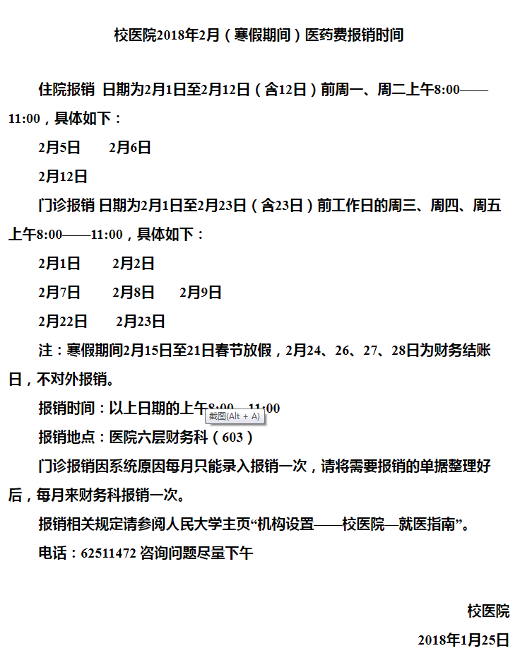 【转发】校医院2018年2月(寒假期间)医药费报销时间